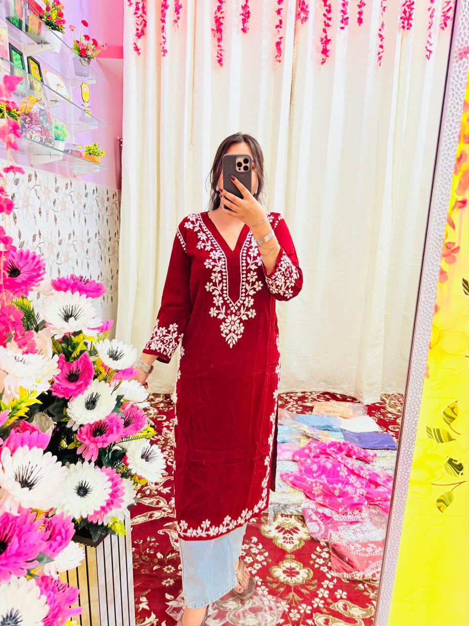 β¨ Step into elegance with this deep maroon long kurti made from soft premium rayon and adorned with 100% original handcrafted Chikankari embroidery!