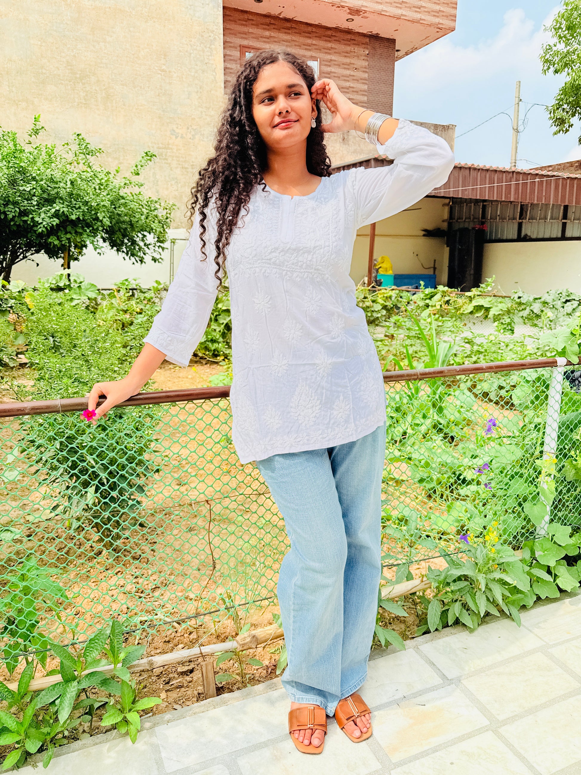 Classic White Lakhnavi Chikankari Short Kurti – 100% Handcrafted Elegance on Soft Cotton 🕊️