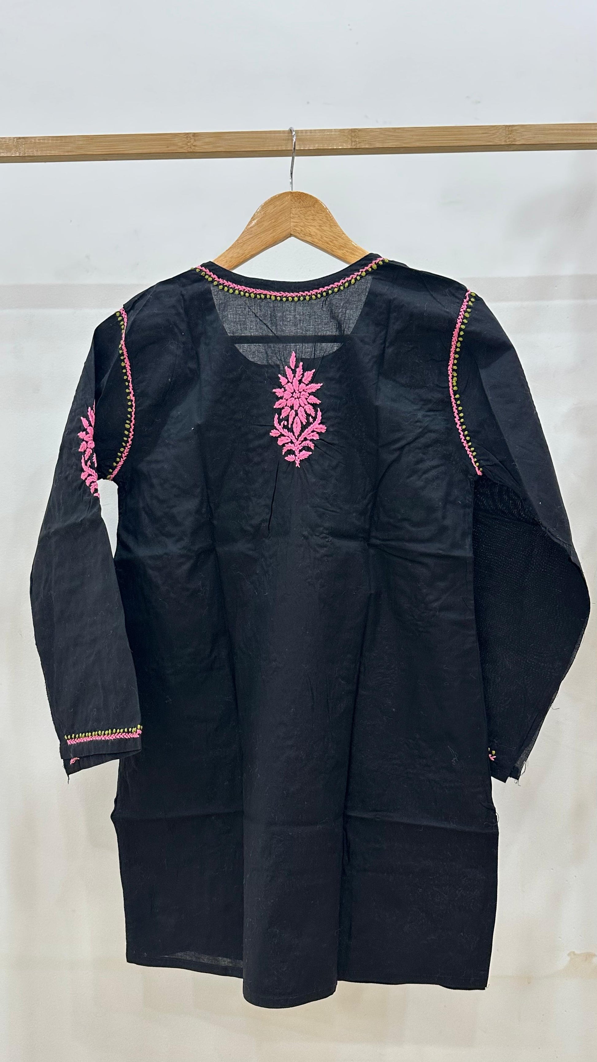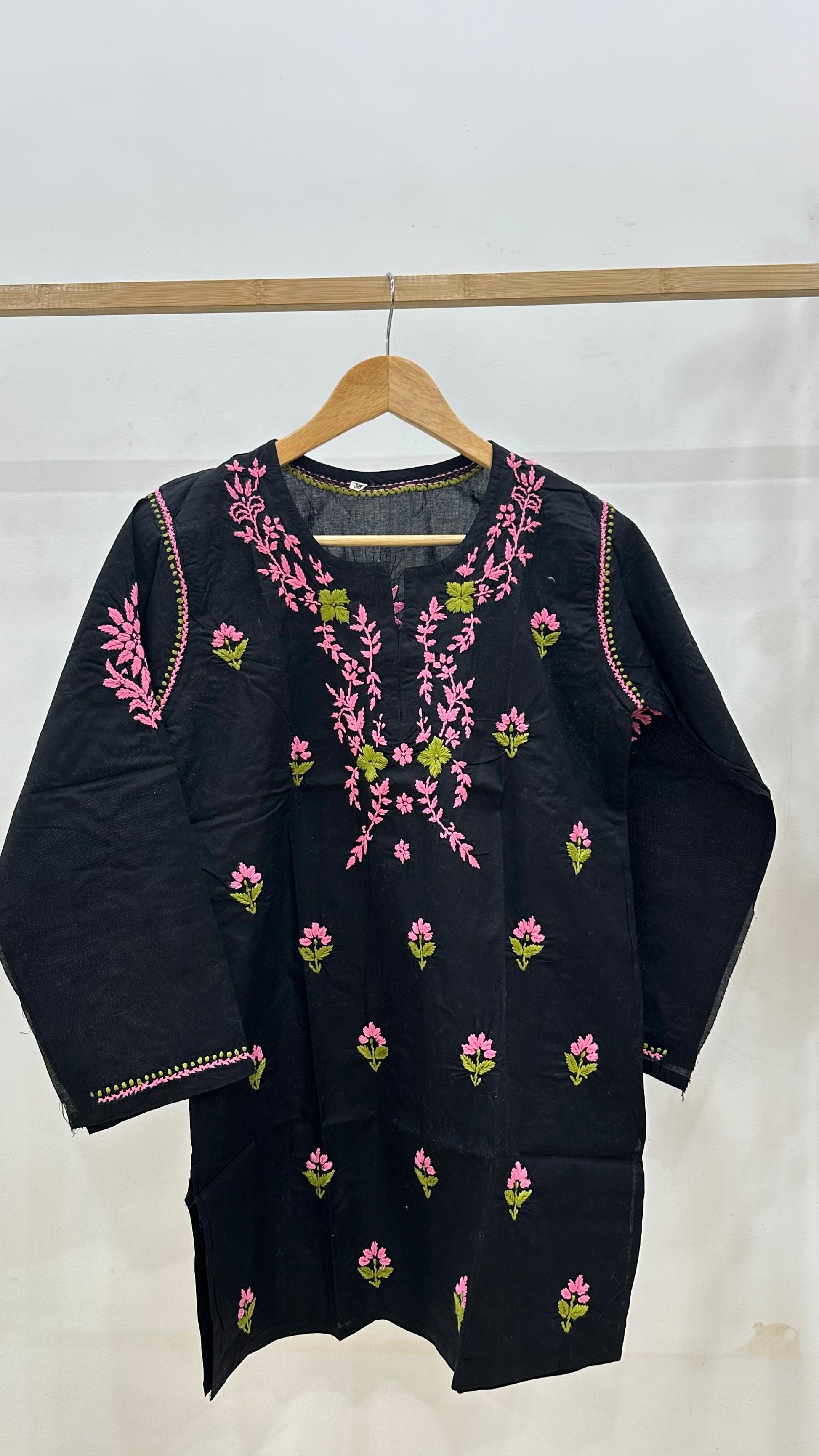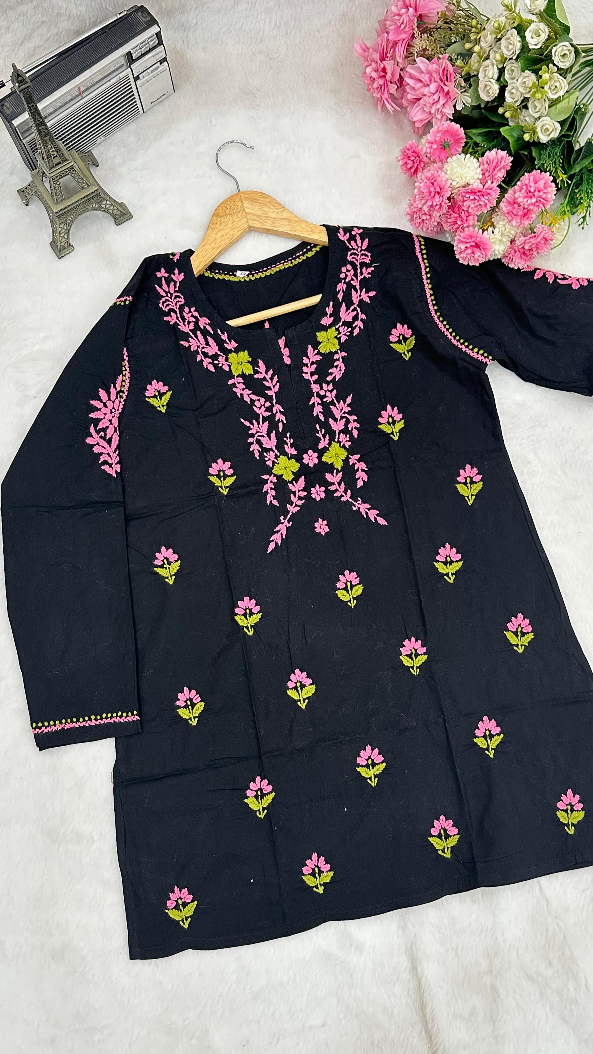 Add grace to your everyday style with this handcrafted short kurti, featuring intricate multi-thread floral Chikankari embroidery on soft cambric cotton. The elegant black base with pink and green threadwork makes it a versatile pick for casual outings, office wear, or festive gatherings. Lightweight, breathable, and stylish β this kurti is a true blend of tradition and modern comfort.