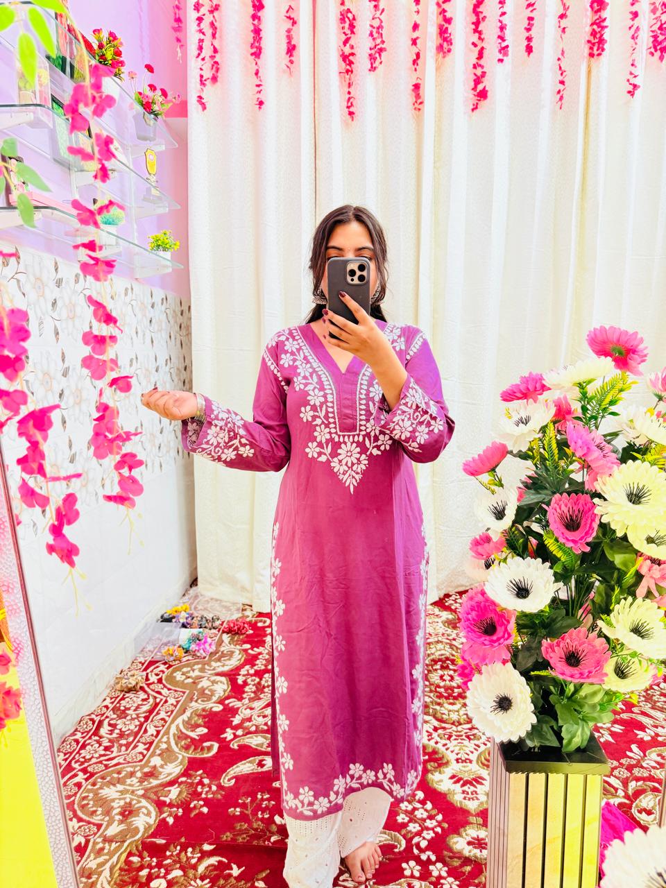 β¨ Step into elegance with this soothing lavender long kurti made from soft premium rayon and adorned with 100% original handcrafted Chikankari embroidery!