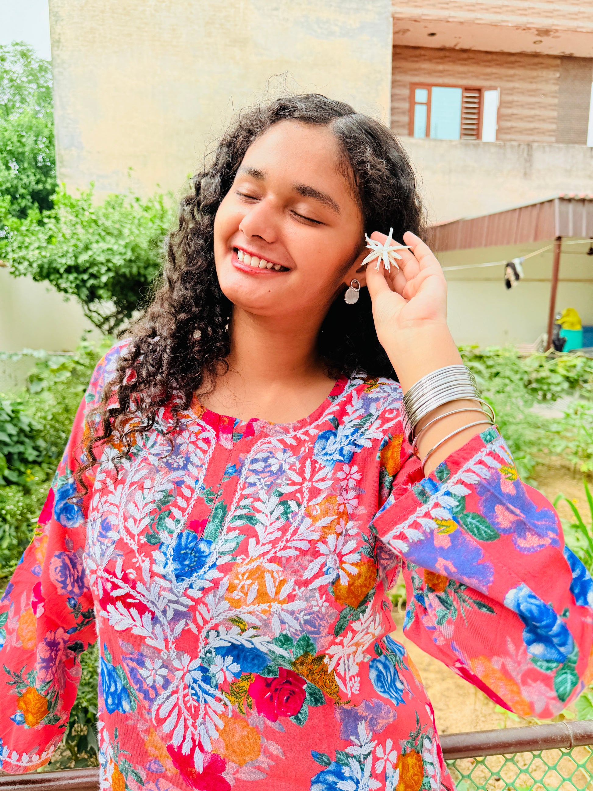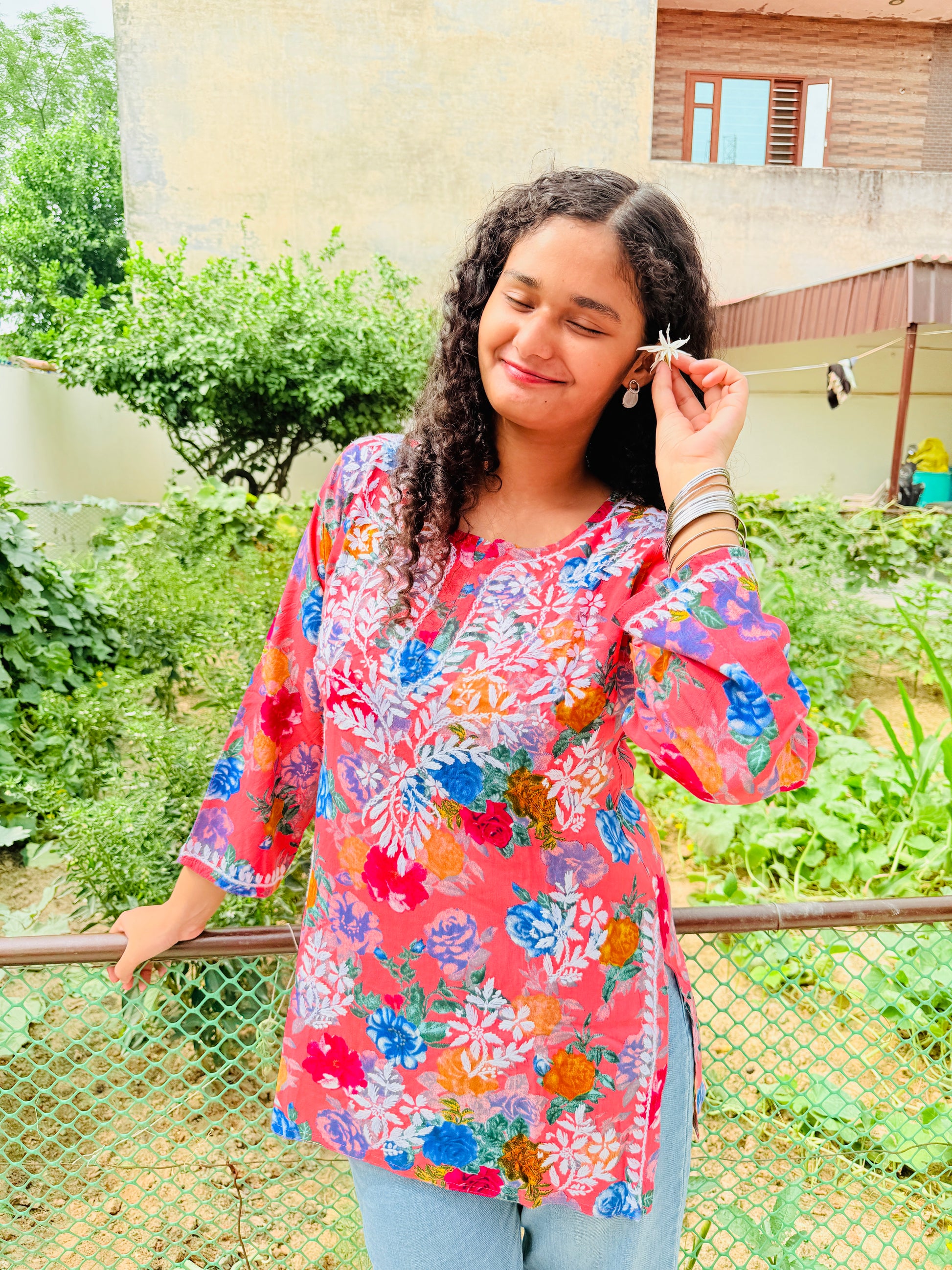 Elevate your ethnic collection with this Rani Pink Lakhnavi Short Kurti, featuring 100% handcrafted Chikankari embroidery in white thread over a vibrant multicolor floral print. The soft rayon fabric ensures a breathable and flowy fit, perfect for all-day comfort.